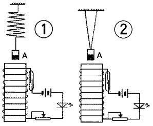 图1是弹簧振子型“永动摆”。要使摆工作,首先将磁摆拉至平衡位置正下方某一位置,由发光二极管显示干簧管接通后再撤去外力,此时摆向上运动,干簧管并不马上断开,螺线管中通过电流产生的磁场上端为N极,与下端为N极的磁铁A相排斥,磁场力对摆做功,增加了摆的机械能。在以后的振动过程中,由于干簧管保持接通状态,摆会继续向下运动,然后又返回这一位置并向上运动一段距离后,干簧管断开。在上述过程中,螺线管中电流的磁场力先后对摆做负功及正功,但使得所做总功为正。为了提高摆的效率,可以在摆的振动过程中适当调节干簧管的位置,以缩短做负功的过程。