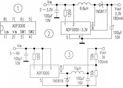 ADP3000是美国ANALOG DEVICES公司生产的新型微功耗开关型DC/DC变换器,它的输入电压范围为2~30V,可用于升压,也可用于降压,变换效率为80%,开关频率为400kHz。内含低电压检测电路,同时具有3.3V、5V和12V固定电压输出式可调输出。