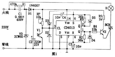 该照明灯电路如图1所示。C1、C2、D1、VD组成电容降压式半波整波滤电路,在C2两端得稳定的12V直流电源供电路使用。IC是一只D型触发器,与R2、C3及R3、R4、D2、D3构成一个可控自激多谐振荡器。当其触输入端CL为低电平时,由于二极管D2、D3的箝位作用,振荡器停振;当CL端为高电平时,振荡器工作,从Q端输出振荡脉冲,振荡周期T=0.7(R2C3+R3C4)。