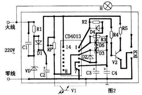 IC选用双D触发器CD4013(只用其中一只触发器)。V1选用3DU2光敏三极管。V2选用9013等NPN型硅晶体管,β>100。BCR选用3A600V双向可控硅TLC336或TLC386。D2~D5选用IN4148开关二极管。H选用220V,25W或40W红色灯泡。其余元件参数如图1所示。